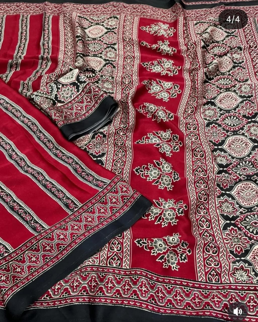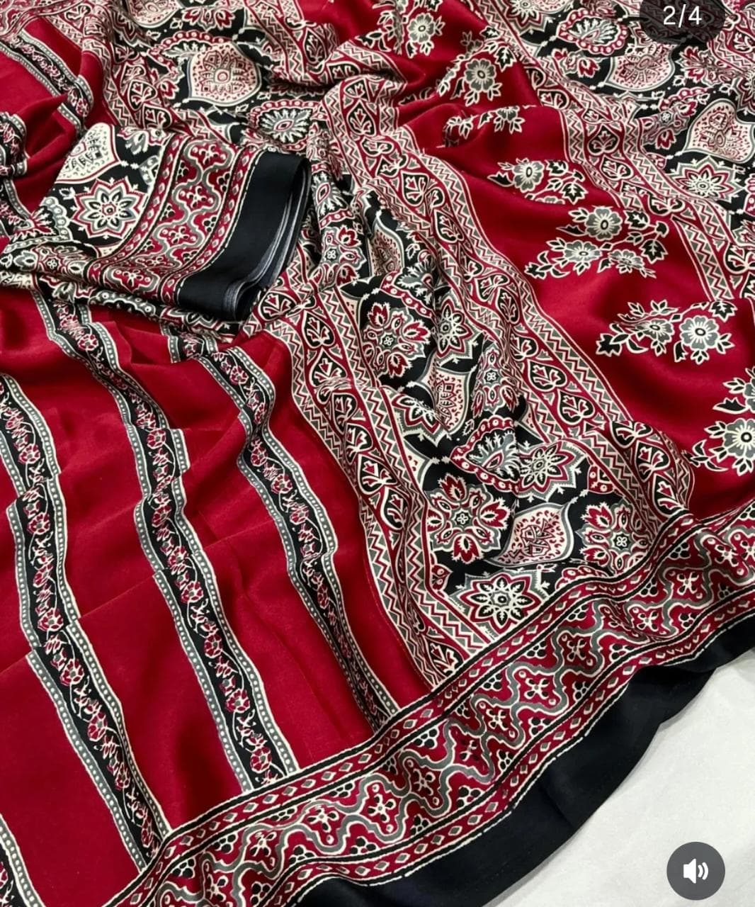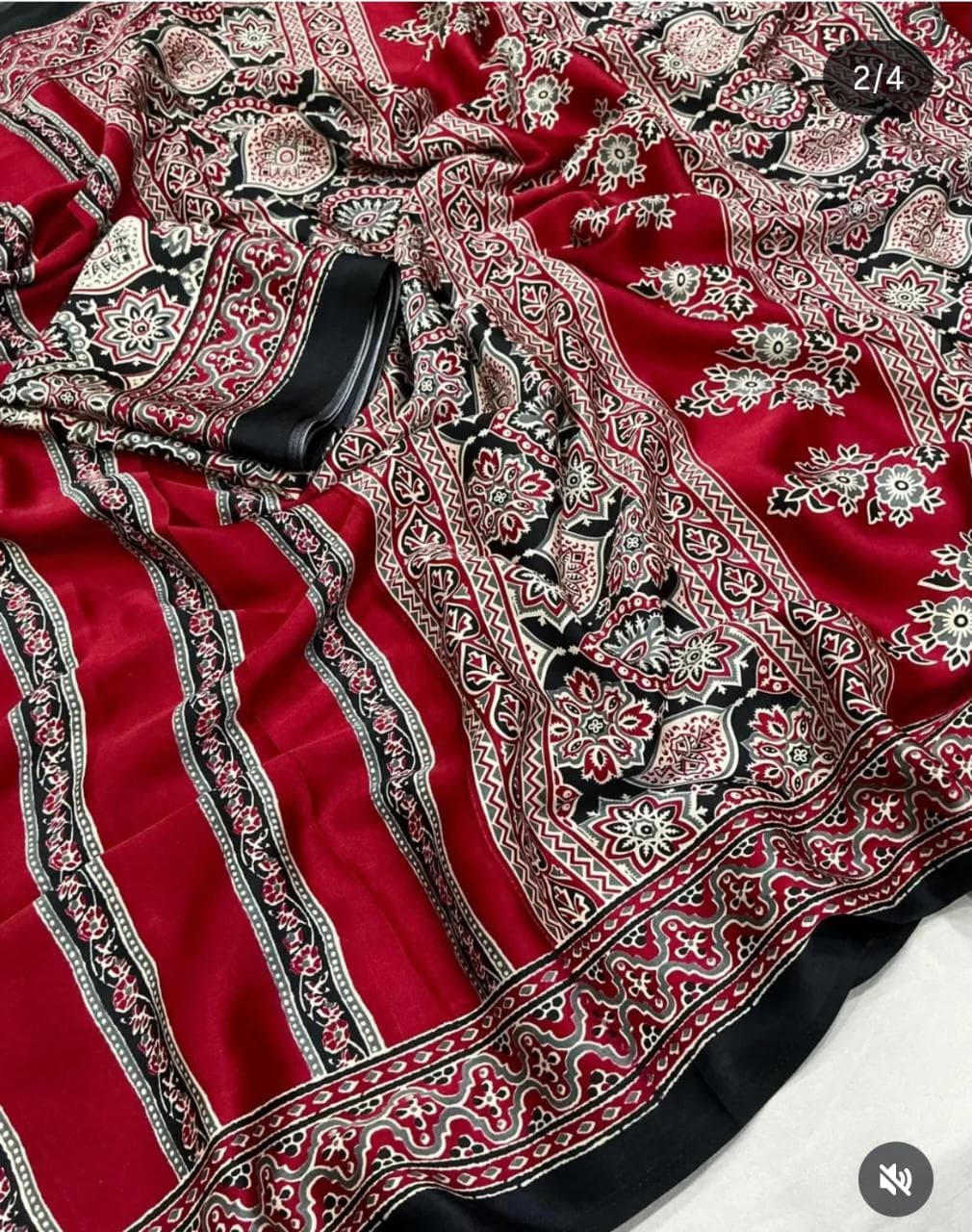 • Elevate your wardrobe with the Akruti Modal Silk Ajrakh Natural Printed Saree. Crafted from luxurious red modal silk, this saree features exquisite Ajrakh natural prints that blend traditional artistry with contemporary style. Its lightweight fabric ensures effortless draping, allowing you to achieve a polished look quickly and comfortably. Perfect for those who appreciate expert craftsmanship and modern elegance in one graceful ensemble.
