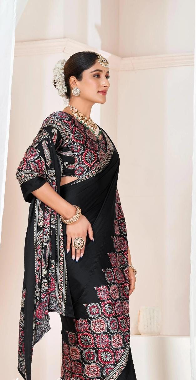 BLACK HALF BORDER AJRAKH SAREE.