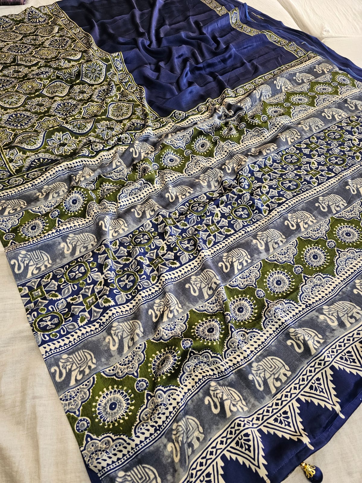 BLUE ELEPHANT PRINTED AJRAKH SAREE