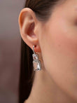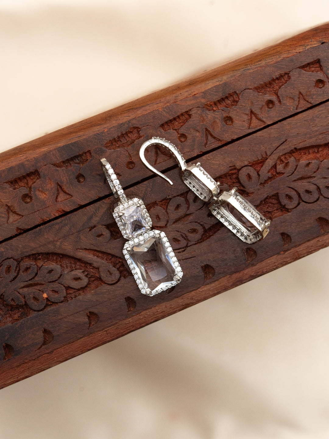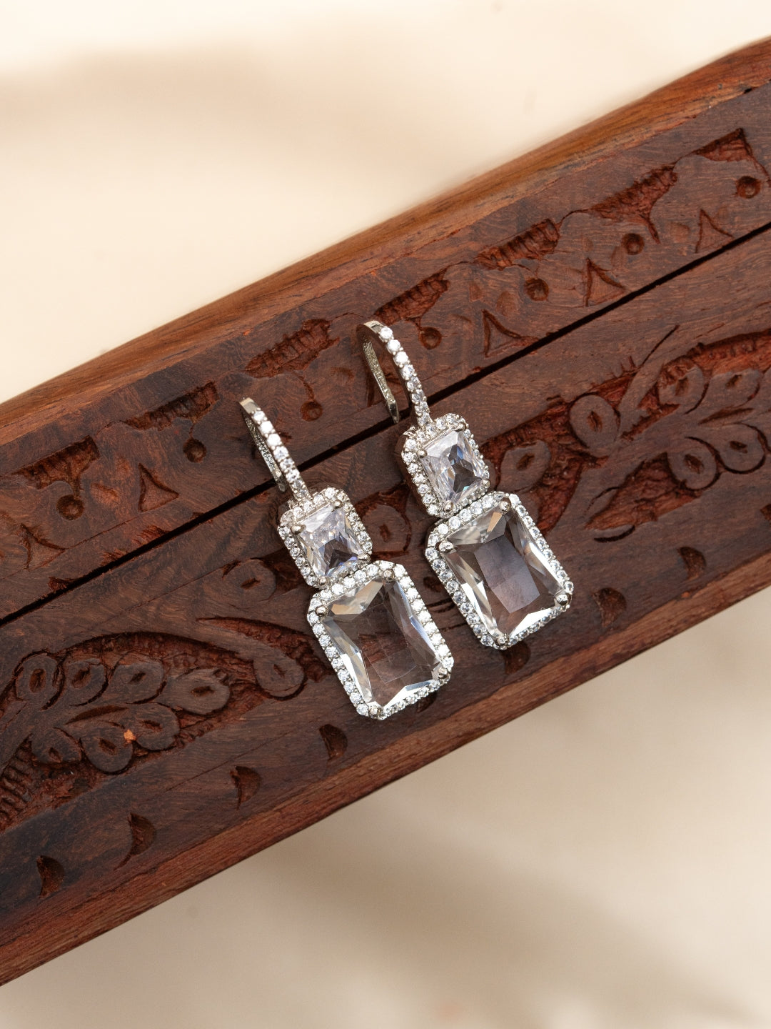 The Crystal Curve Earrings feature a striking rectangular silhouette, plated in luxurious Silver and embellished with radiant cubic zirconia stones. Designed to dazzle with every turn, the dual-stone setting brings modern elegance, refined sparkle, and a graceful curve to elevate any look.