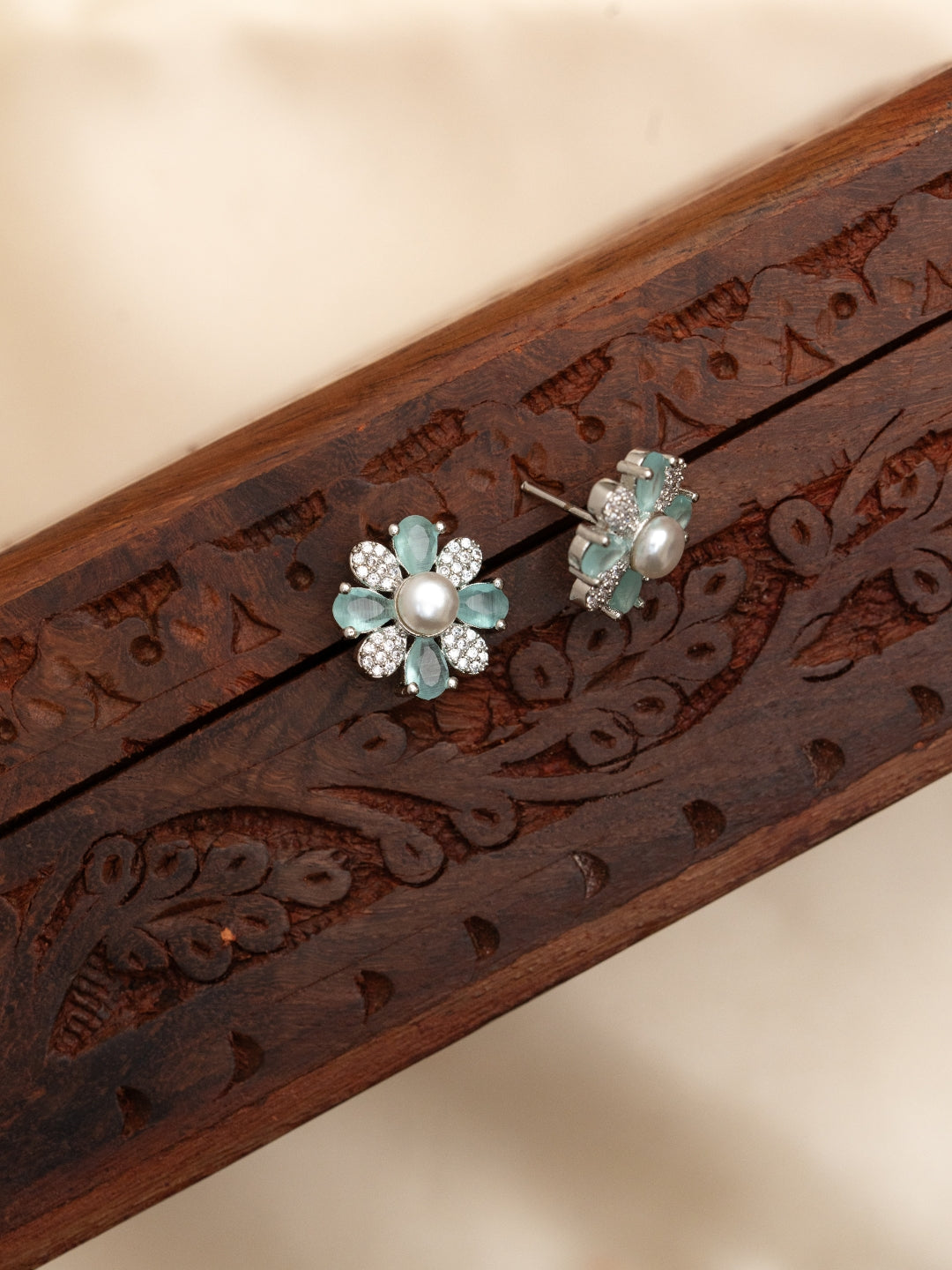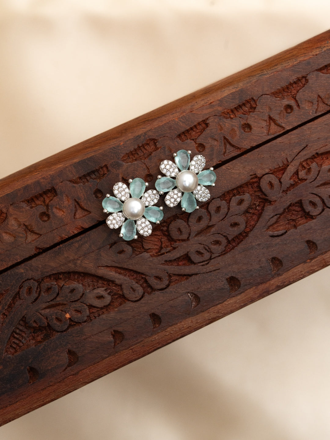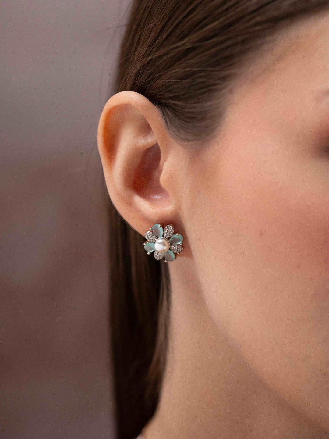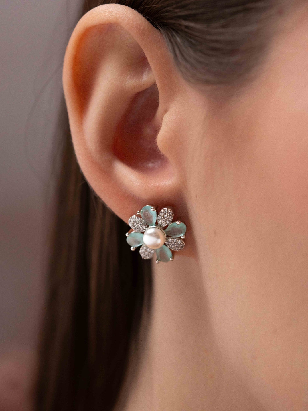 The nooriya earrings feature a charming flower-shaped stud design with a luminous pearl at the center. Plated in 18k gold, these earrings blend classic elegance with a soft, feminine touch—perfect for everyday wear or special occasions.