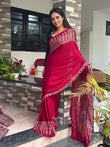 • Elevate your wardrobe with the Akruti Modal Silk Ajrakh Natural Printed Saree. Crafted from luxurious red modal silk, this saree features exquisite Ajrakh natural prints that blend traditional artistry with contemporary style. Its lightweight fabric ensures effortless draping, allowing you to achieve a polished look quickly and comfortably. Perfect for those who appreciate expert craftsmanship and modern elegance in one graceful ensemble.
