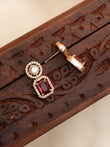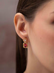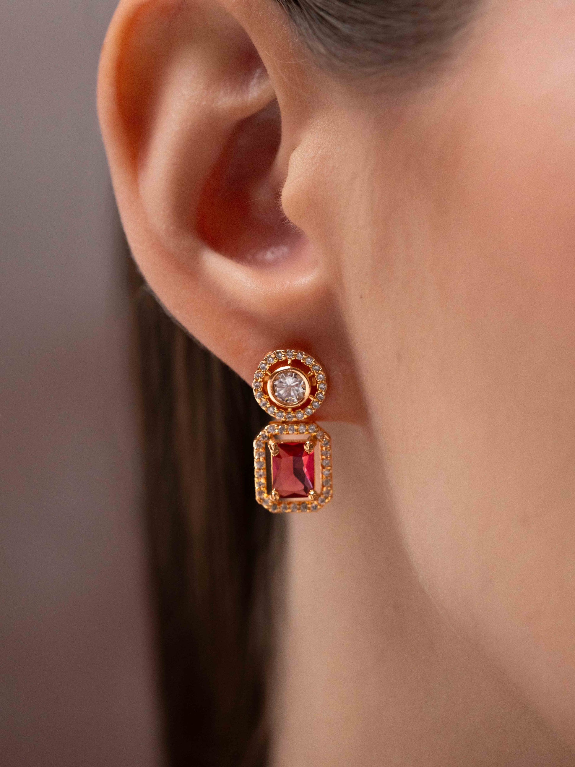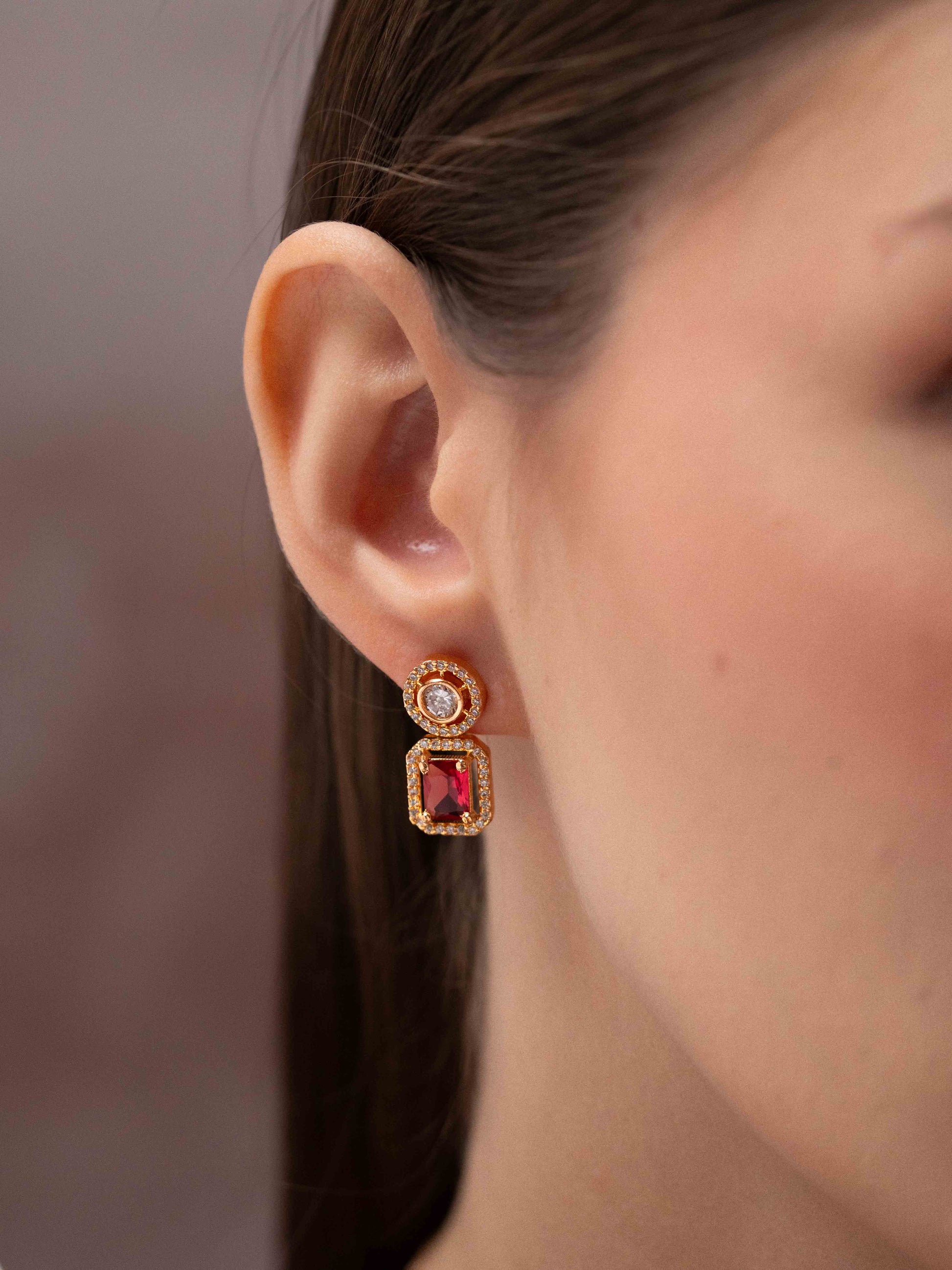 The ruby earrings feature a round stud paired with a drop-shaped emerald-style centerpiece. Framed with a border of shimmering small diamonds and finished in 18k gold plating, these earrings bring a regal touch to any traditional or festive look.