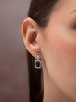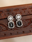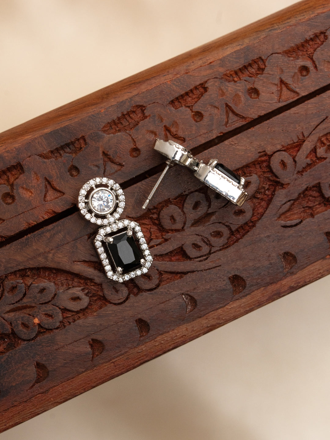 The ruby earrings feature a round stud paired with a drop-shaped emerald-style centerpiece. Framed with a border of shimmering small diamonds and finished in 18k gold plating, these earrings bring a regal touch to any traditional or festive look.